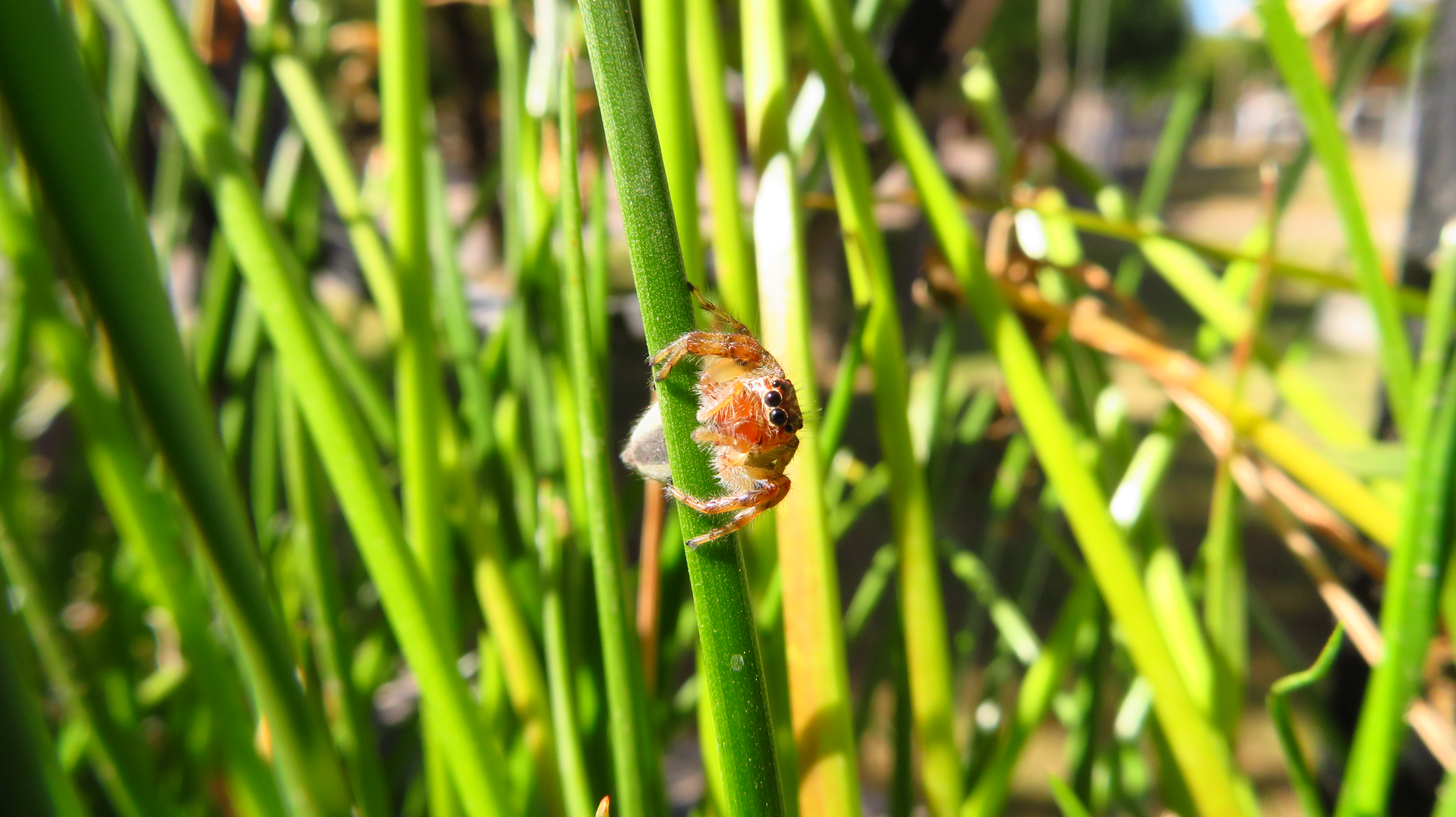 Sobre el tallo de una margarita observamos una araña saltarina con sus ocho patas y sus ocho ojos simples que le permiten obtener una vista de 360°. Comparten grupo taxonómico con las garrapatas, aunque en nada se parecen. Las arañas no son insectos sino invertebrados artrópodos ya que sus patas se encuentran articuladas. Observamos una de las casi 6.000 especies de arañas saltarinas o caza moscas que existen. Forman en conjunto la familia más grande de arañas, las Salticidae. Son muy rápidas y saltarinas, por lo que fotografiarlas de frente conlleva paciencia. En la imagen se observan las características de los pelos de mayor diámetro y volumen que nos indica que se trata de una hembra.