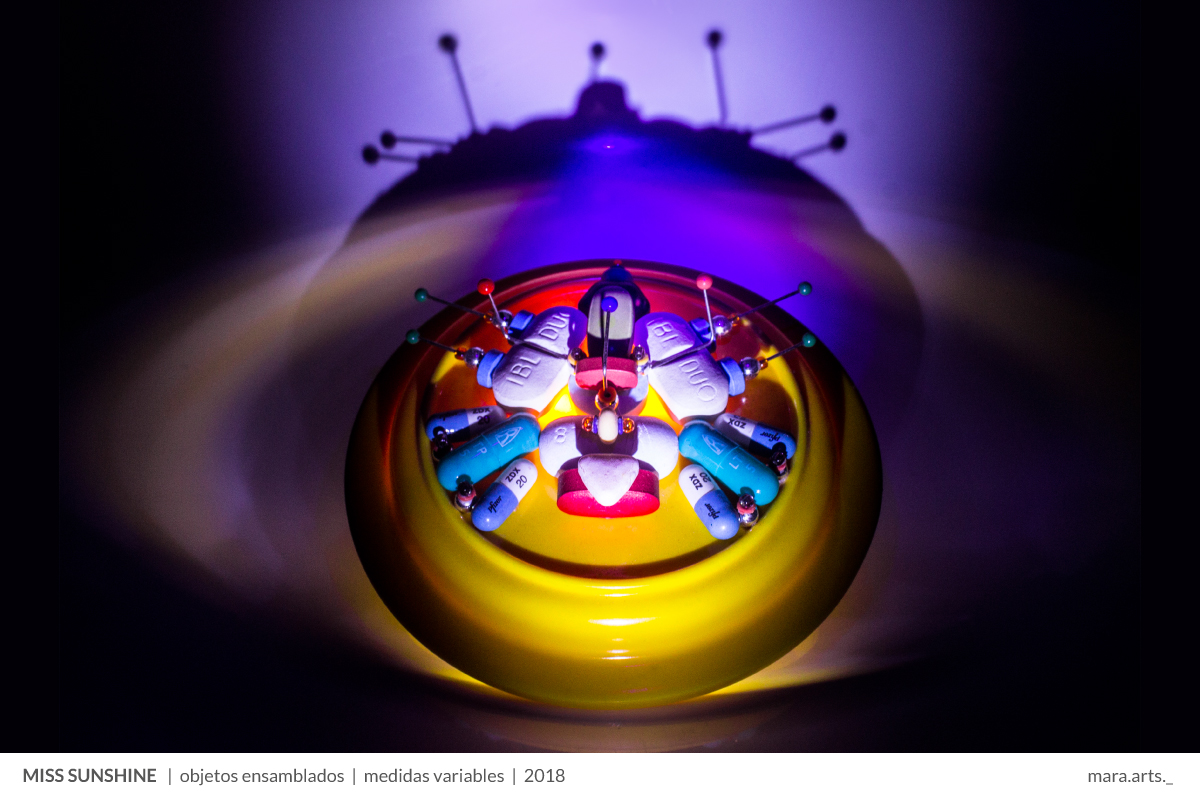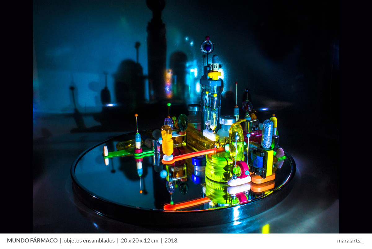 En las obras se desvanecen las disciplinas tradicionales relacionadas con los modelos estéticos hegemónicos. Cada pieza está planteada a partir de esquemas organizados con pastillas, medicinas, drogas, medicamentos, antídotos -cualquiera sea la forma de denominación-, además de componentes electrónicos.