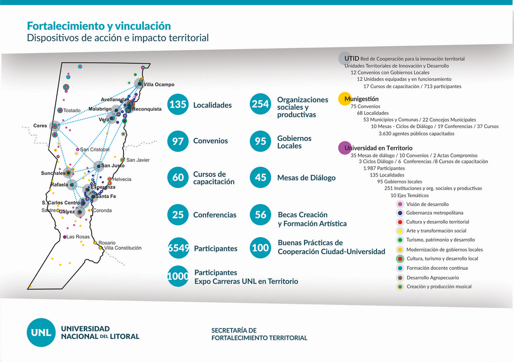 La UNL profundiza su estrategia de vinculación con el territorio, a partir del diálogo como estrategia y el trabajo en red con gobiernos locales, organizaciones e instituciones públicas y privadas, prioritariamente de la región centro – norte de la provincia de Santa Fe. En sus 12 Unidades Territoriales de Innovación y Desarrollo (UTID) trabaja junto a actores del medio social, cultural y productivo en líneas estratégicas de desarrollo y competitividad territorial, planteadas a partir de necesidades identificadas en la escala subregional o metropolitana. Esta visión integral sobre el desarrollo regional se plasma también en la capacitación de equipos técnicos de municipios y comunas para fortalecer las capacidades de gestión e innovación política.