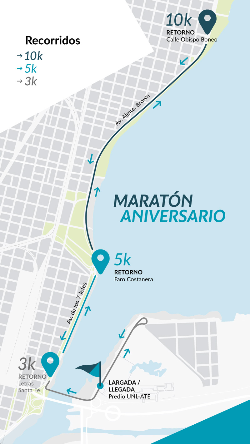 El circuito de 10 kilómetros tiene como salida el Predio UNL-ATE hacia el Norte; toma la rotonda del final de la Costanera Este; retoma hacia el Sur; cruza el Puente Colgante; dobla hacia el Norte para tomar Costanera Oeste hasta calle Boneo; vuelta y regreso por Costanera Oeste hacia el Sur; dobla al Este para cruzar el Puente Colgante y finaliza en la puerta del Predio UNL-ATE.