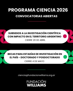 La Fundación Williams lanza su Programa Ciencia 2026 con dos nuevas convocatorias: un concurso de subsidios a la investigación científica con impacto en el territorio argentino que otorgará hasta $22.000.000 por proyecto, y un llamado a becas para realizar estadías de investigación doctoral y posdoctoral en el país.