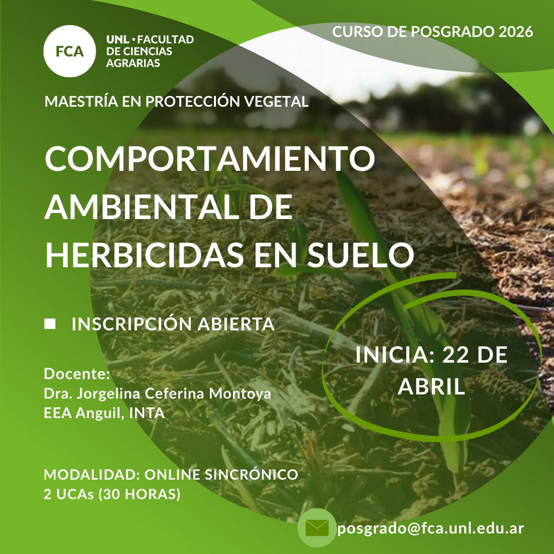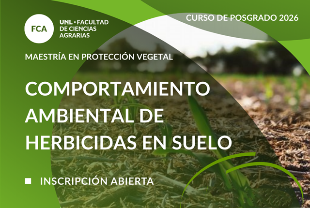 La intensificación de la producción agrícola ha conducido al incremento en la utilización de plaguicidas y en particular de herbicidas en sistemas bajo siembra directa. Por tal motivo, existe un interés creciente en conocer el comportamiento ambiental de estas sustancias a fin de reducir o evitar posibles impactos en los agroecosistemas. En este marco se desarrollará el Curso de Posgrado Maestría en Protección Vegetal, en la Facultad de Ciencias Agrarias de la UNL, denominado Comportamiento ambiental de herbicidas en suelo, dirigido a Ingenieros Agrónomos o título afín con experiencia profesional en manejo y control de plagas, con modalidad online sincrónico inicia el 22 de abril de 2026.