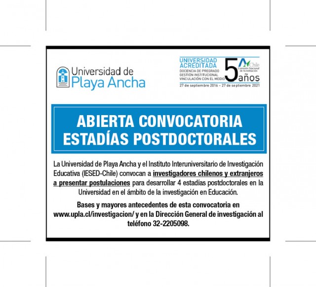 Está abierta la convocatoria a "Estadías Postdoctorales 2019" que realiza la Universidad de Playa Ancha de Ciencias de la Educación en conjunto con el Instituto Interuniversitario de Investigación Educativa (IESED-Chile)