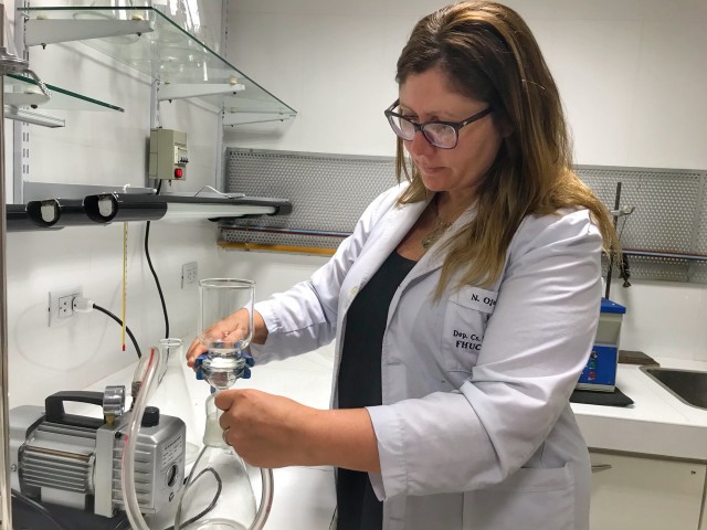La Lic. Natalí Romero, becaria doctoral Conicet, quien también se desempeña en el Laboratorio de Ecotoxicología de la FHUC-UNL, relata que hay distintas maneras de generar nanopartículas. “En este caso, se realizó una síntesis química utilizando nitrato de plata, un reductor: borohidruro de sodio y polivinilpirrolidona que funciona como recubrimiento y estabilizador. Al realizar esta reacción química, los iones de plata se agrupan y se forman nanopartículas, que poseen propiedades biocidas contra bacterias, hongos y virus. Lo que se pretende es emplear estas nanopartículas para reducir la carga bacteriana del efluente al pasar por los filtros diseñados, y poder emplearlo en otras aplicaciones como, por ejemplo, fertilizantes líquidos”.