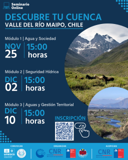 Se invita a la comunidad UNL a participar del ciclo de seminarios web “Descubre tu Cuenca: Valle del Río Maipo, Chile”, organizado por el Programa Hidrológico Intergubernamental de la UNESCO para América Latina y el Caribe (PHI-LAC) a través de su grupo de trabajo sobre Educación y Culturas del Agua y el Comité Nacional para el PHI (CoNaPHI) Chile.