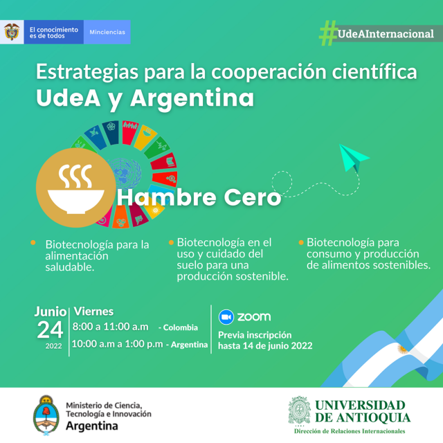 Argentina ha sido un país socio con el cual la Universidad de Antioquia ha consolidado una larga trayectoria en cooperación académica y científica, en esta oportunidad, con la Embajada de Argentina en Colombia y la Dirección Nacional de Promoción de la Política Científica, buscan establecer una agenda que posibilite intercambiar avances científicos en relación al ODS N°2 Hambre cero e identificar potenciales oportunidades de trabajo conjunto.