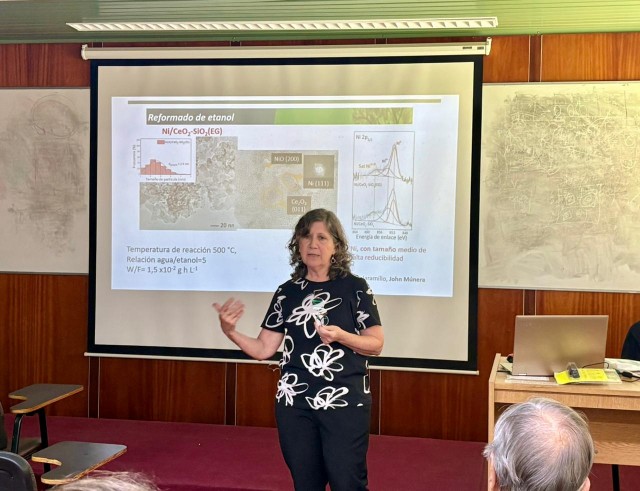Durante su exposición, la Ing. Cornaglia abordó los principales desafíos asociados a la transición energética, destacando la necesidad de integrar una mayor proporción de energías renovables en la matriz energética actual, aún dominada por los combustibles fósiles. En este contexto, presentó distintas líneas de investigación orientadas a la producción limpia de energía, con especial énfasis en la producción de hidrógeno acoplada a la captura y utilización de dióxido de carbono. Además, mostró los avances en el aprovechamiento de residuos y subproductos de la industria regional para el desarrollo de materiales con mayor valor agregado destinados a estas aplicaciones.