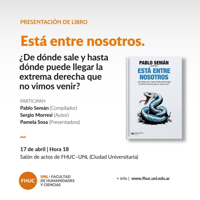 El día miércoles 17 de abril a las 18 hs. en el Salón de Actos de la FHUC-UNL, se llevará a cabo la presentación del libro "Está entre nosotros. ¿De dónde sale y hasta dónde puede llegar la extrema derecha que no vimos venir?" de Pablo Semán (Coord.).