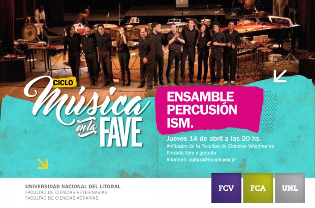 El jueves 14 de abril a la hora 20 en el Anfiteatro de la Facultad de Ciencias Veterinarias (FCV-UNL), dará inicio al ciclo “Música en la FAVE”, con la presentación de Ensamble de Percusión ISM.