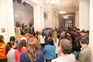 La comunidad universitaria del Litoral desbordó el hall del Rectorado de la UNL este mediodía para abrazar simbólicamente la universidad pública y reclamar por el cumplimiento de la Ley de Financiamiento Universitario en una jornada nacional.