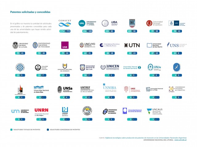 El informe señala que, un total de 728 familias de patentes o desarrollos que las instituciones universitarias pertenecientes al CIN han decidido proteger a través del sistema de patentes, de los cuales el 58% comprenden al menos una solicitud en cotitularidad con Conicet, lo que subraya la fuerte sinergia entre ambos organismos. Además, se identificaron colaboraciones entre universidades, con empresas y con otras instituciones de ciencia y tecnología como la Comisión Nacional de Energía Atómica, YPF e Inis Biotech.