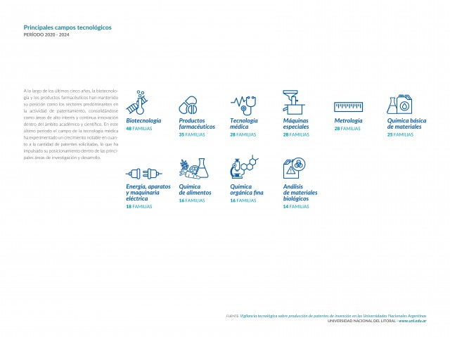 A lo largo del tiempo, la biotecnología y los productos farmacéuticos han mantenido su posición como los campos tecnológicos líderes en la actividad de patentamiento de las universidades nacionales. Sin embargo, en el último período, se observó un notable crecimiento en el campo de la tecnología médica, que se consolida como un área de alta relevancia en la investigación y el desarrollo.