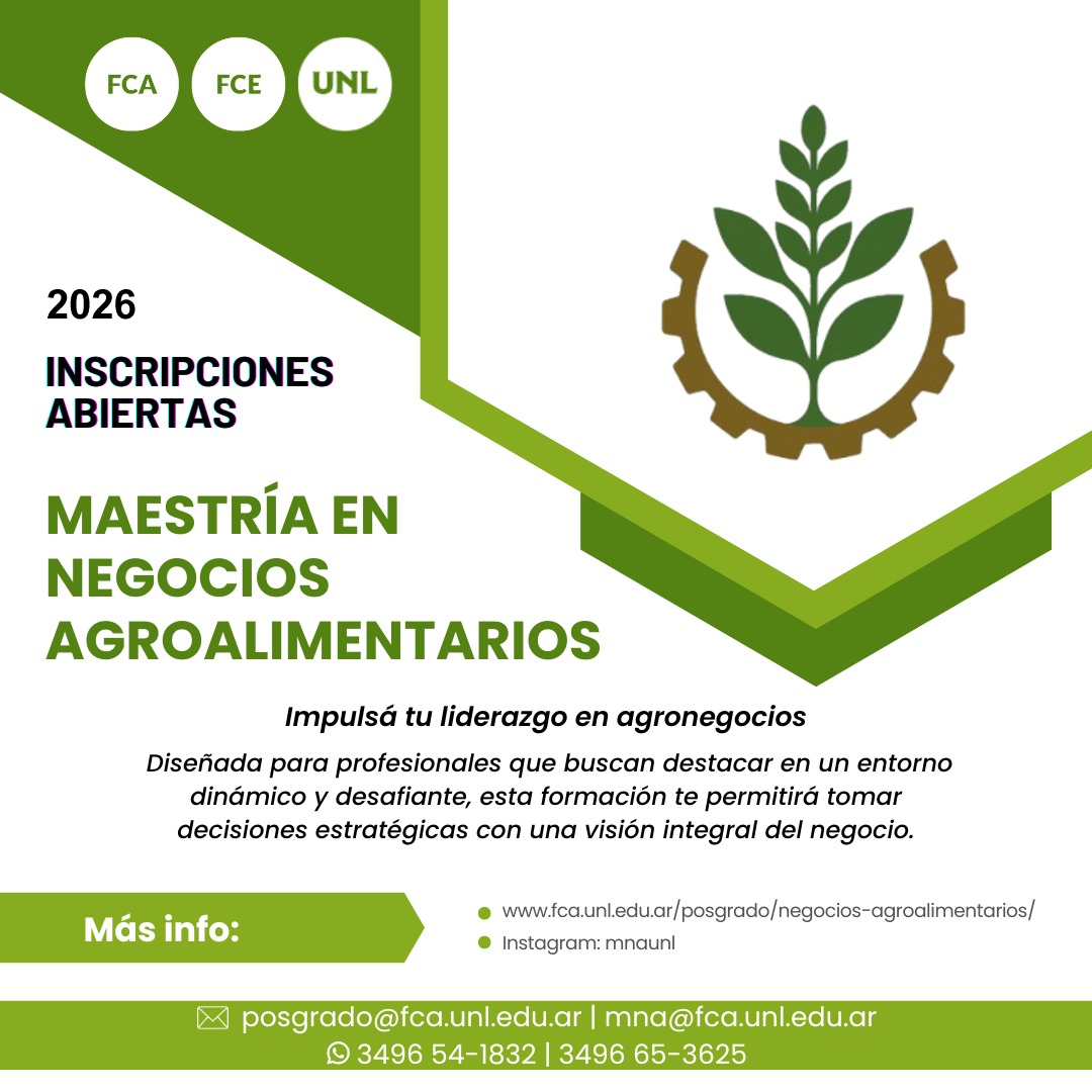 Más info: www.fca.unl.edu.ar/posgrado/negocios-agroalimentarios