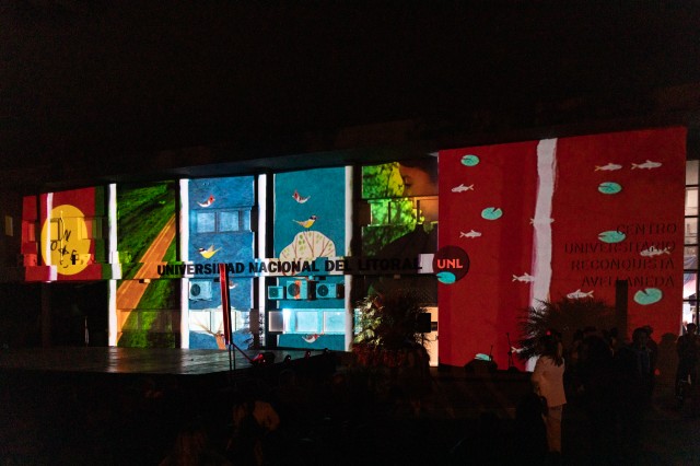 Cientos de personas visitaron este jueves desde la tarde hasta la noche el Centro Universitario Reconquista – Avellaneda para acompañar a las autoridades en el acto protocolar y para disfrutar de forma libre y gratuita de la programación cultural organizada por la UNL. Por un lado, se pudo recorrer tanto la muestra itinerante Crearte Litoral como la exposición “Relato de un símbolo. Historia, alegoría y diseño” sobre el rediseño del Sello Mayor de la Universidad. A su vez, se pudo interactuar con los dispositivos lúdicos “Hibridación Juguemos en la cuña boscosa” e “Hibridación Jauukanigas”. También se concretó el mapping “Anomalías audiovisuales” sobre la fachada del edificio institucional y sobre el escenario se ofreció un concierto de “Pibas de Monte”, las actuaciones de las escuelas de danzas Muna-Munanky y Meraki Ballet y el show de la Comparsa Bambita.
