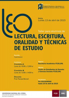 En el marco del Programa Enseñanza y Aprendizaje en la Facultad de Ciencias Jurídicas y Sociales (FCJS), de la Universidad Nacional del Litoral, se lanza una nueva edición de "LEO", un taller para el desarrollo de habilidades de lectura, escritura y oralidad para estudiantes de esta Facultad.