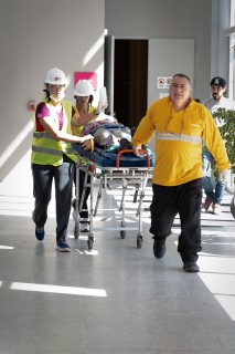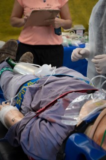 El escenario continuó con el traslado primario desde la zona del evento hasta el hospital simulado. “Allí se realizó la recepción de los pacientes en un espacio acondicionado como departamento de emergencias para alojar a pacientes críticos, donde se contaba con el servicio de médicos y enfermeros, los cuales completaron el proceso de asistencia de las víctimas”, apuntó el Méd. David Biegkler.