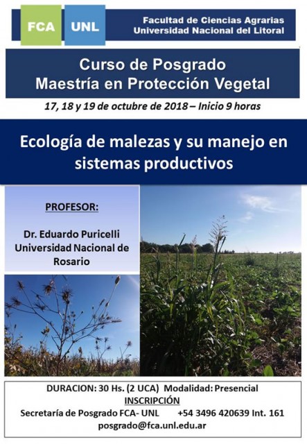 En el marco de la Maestría en Protección Vegetal, los días 17, 18 y 19 de octubre se desarrollará el curso de posgrado Ecología de malezas y su manejo en sistemas productivos. Es presencial.
