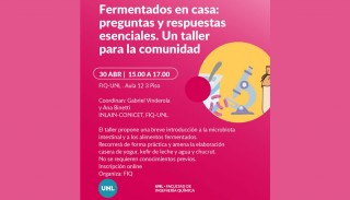 Se informa a la comunidad UNL que el 30 de abril, desde las 15.00h hasta las 17.00h, en el Aula 12 3° Piso / FIQ-UNL se desarrollará el taller: "Fermentados en Casa". Coordinan: Gabriel Vinderola y Ana Binetti (INLAIN-CONICET, FIQ-UNL)