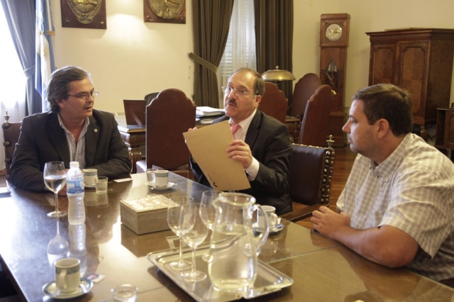El vicerrector de la UNL, Miguel Irigoyen, junto al decano de la Facultad de Ingeniería Química Enrique Mammarella; el secretario General de la Universidad, Pedro Sánchez Izquierdo, y el secretario General de la FIQ, Adrián Bollatti, recibieron a Noguera e intercambiaron opiniones y posibilidades de incrementar cursos de acción entre ambas instituciones de Educación Superior.